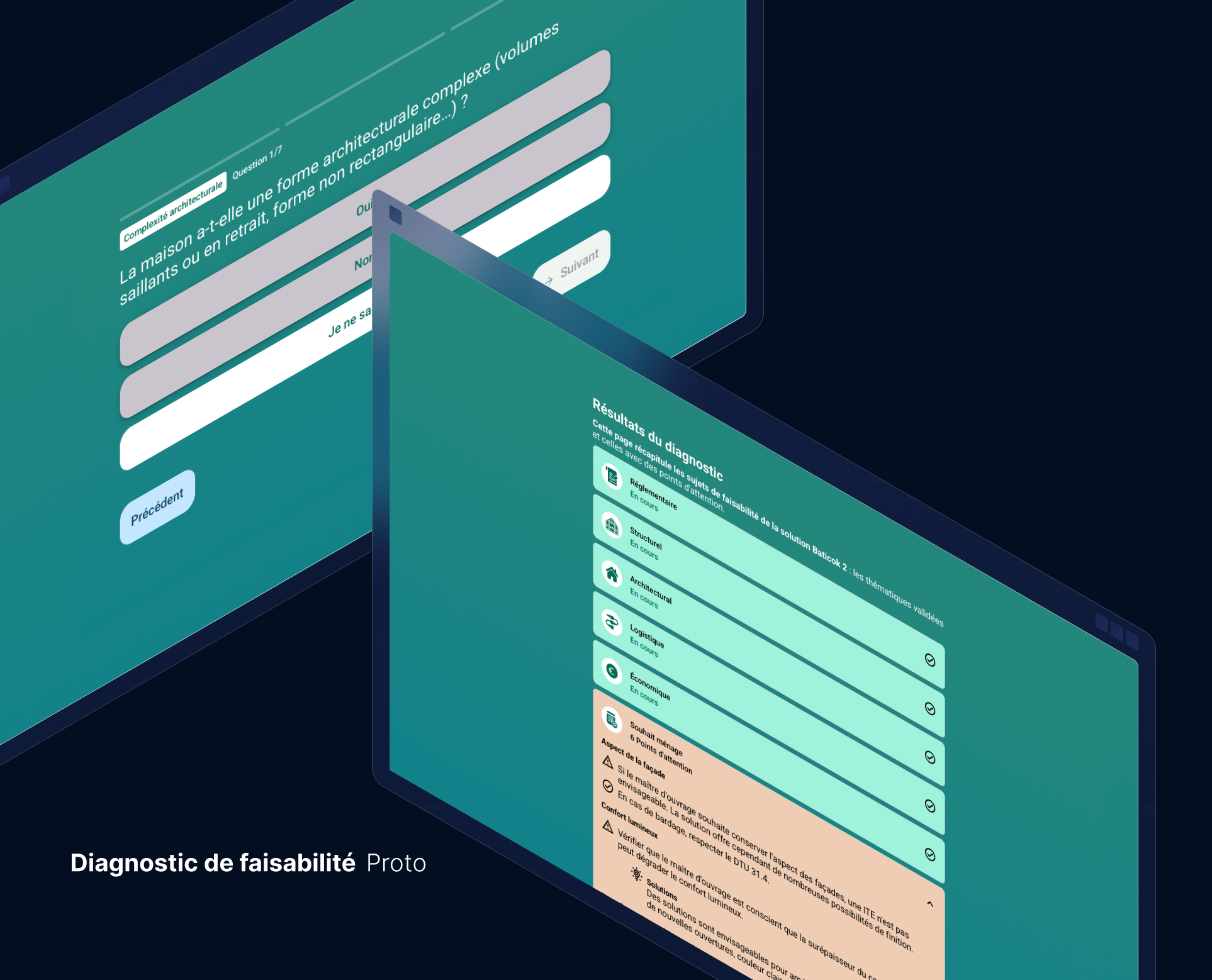 Mandatée par le CSTB, j'ai conduit une recherche utilisateur stratégique sur deux outils d'aide à la décision pour les pros de la rénovation énergétique. Objectif : évaluer leur pertinence réelle avant déploiement, au-delà de l'utilisabilité. 23 professionnels testés, une conclusion centrale : les outils informent, mais n'aident pas encore à décider.